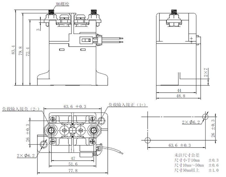注:產品主觸頭按接線柱旁邊標示“1+”的連接負載“+”端,接線柱旁邊的標示“2-”的連接負載 “-”端